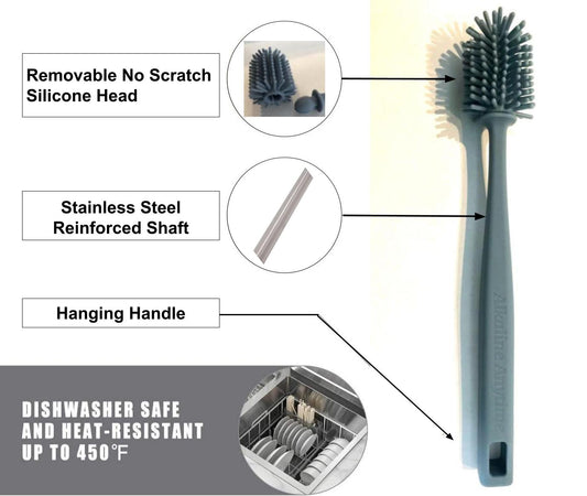 Cepillo de botella alcalino en cualquier momento de silicona de 8.5 ", manija colgante, acero reforzado, ideal para biberones, matraces, cristalería, perfectos para botellas pequeñas